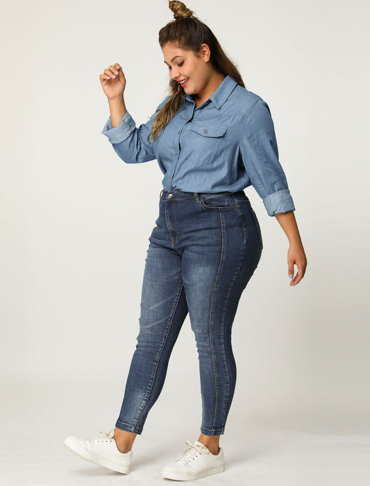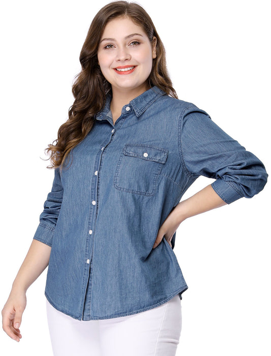 Women's Plus Size Denim Shirt Long Sleeves Chest Pocket Button Down Chambray Shirt