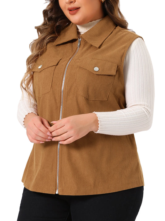 Women Plus Size Utility Vest Corduroy Sleeveless Lapel Zipper Lightweight Jackets Vest