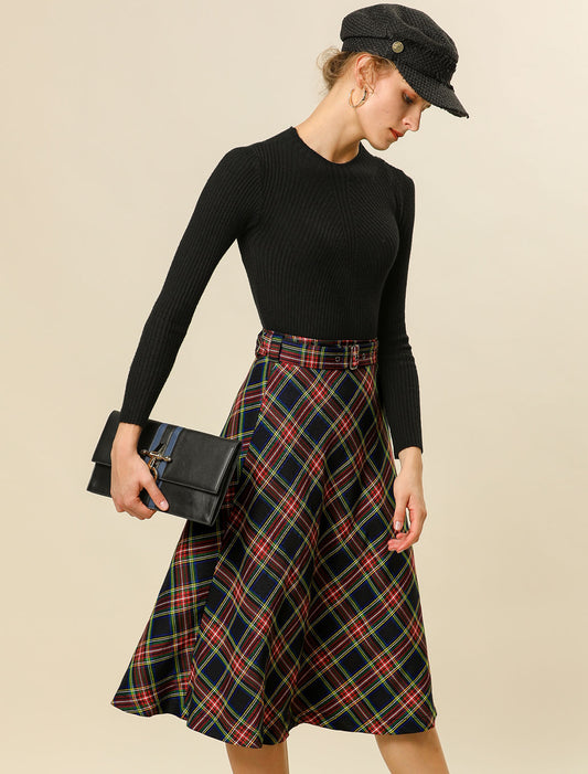 Women's Tartan Plaid High Waist Belted Vintage A-Line Midi Skirt (Available in Plus Size)