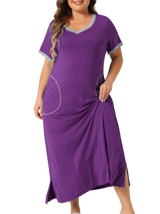 Women's Plus Size Long Nightgowns Short Sleeve Loungewear V Neck Sleepwear with Pockets