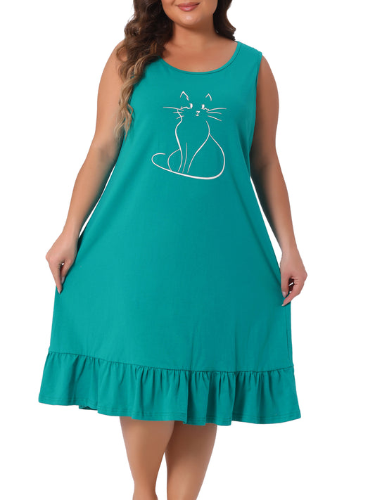 Women Plus Size Sleeveless Nightdress Cute Cat Sleepwear Pajamas Nightgown Loungewear