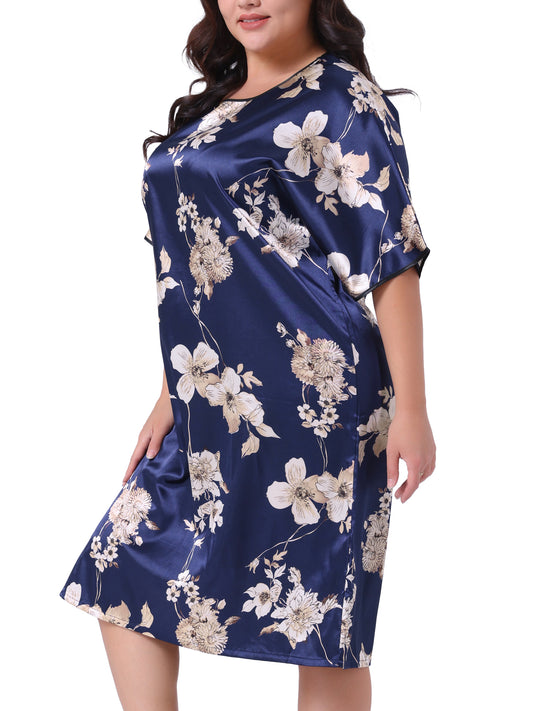 Women Plus Size Nightgown Satin Floral Print Short Sleeve Round Neck Midi Sleepwear