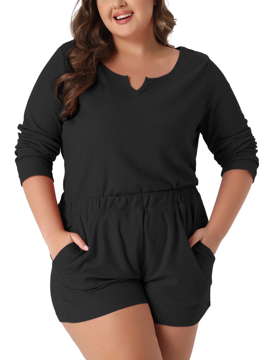 Women Plus Size Loungewear Waffle 2 Piece Long Sleeved Tops and Shorts Pajama Sweatsuits Set
