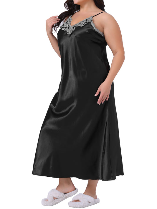 Women Plus Size Lingerie Satin Lace Chemise Nightgown V-Neck Cami Sleeveless Dress Sleepwear