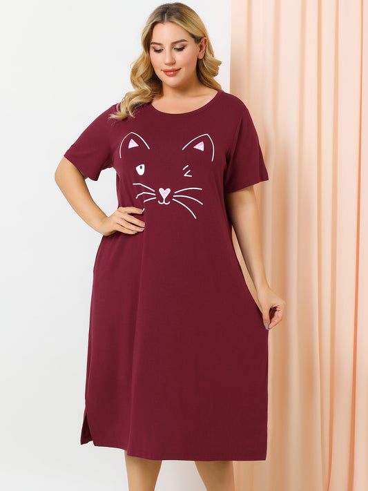 Women's Plus Size Nightgowns Pajama Dress Cute Cat Loose Loungewear with Pockets