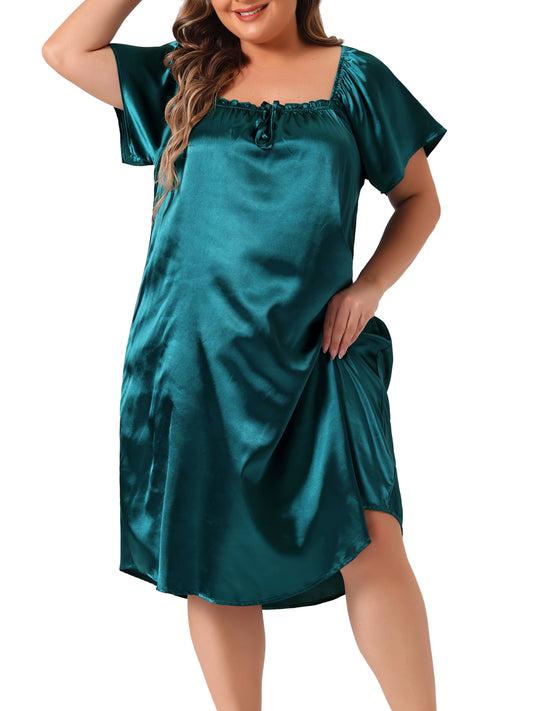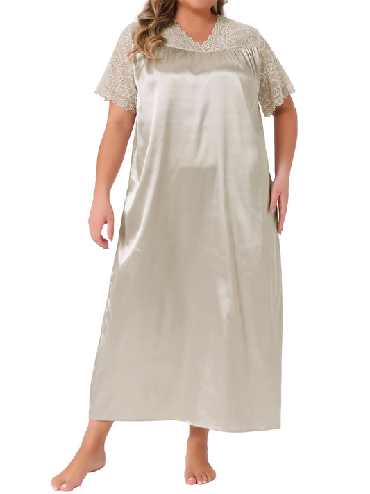 Women Plus Size Nightgown Lace Short Sleeve Dress V Neck Satin Maxi Sleepwear