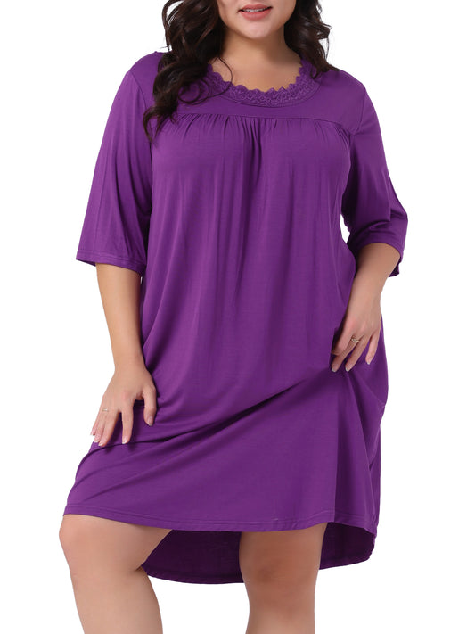 Women's Plus Size Nightgown 3/4 Sleeve Sleepwear Lace Sleep Gowns Pleated V Neck Loungewear