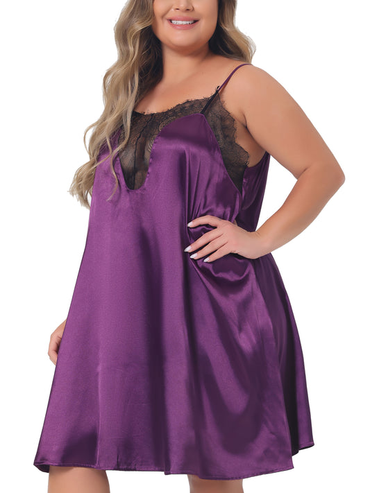 Women Plus Size Lingerie Satin Lace Chemise Nightgown V-Neck Cami Sleeveless Dress Sleepwear