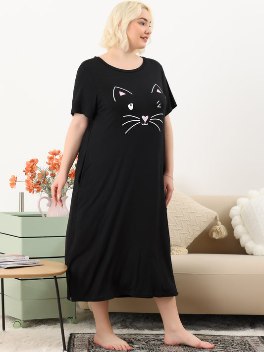 Women's Plus Size Nightgowns Pajama Dress Cute Cat Loose Loungewear with Pockets