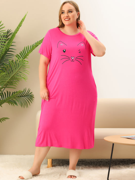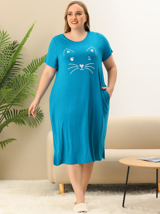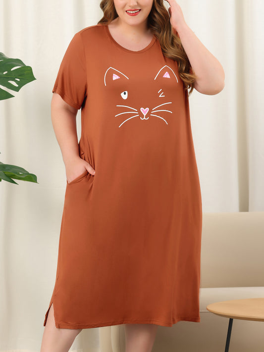 Women's Plus Size Nightgowns Pajama Dress Cute Cat Loose Loungewear with Pockets