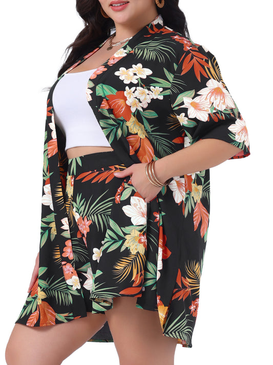 Women Plus Size 2 Piece Outfit Tropical Print Kimono Floral Top and Shorts Set