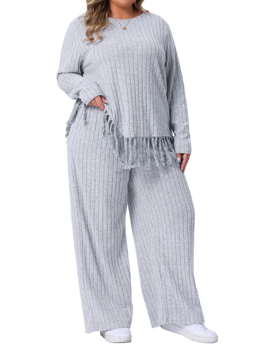Women Plus Size 2 Piece Lounge Set Crew Neck Long Sleeve Asymmetrical Fringe Hem Casual Outfit