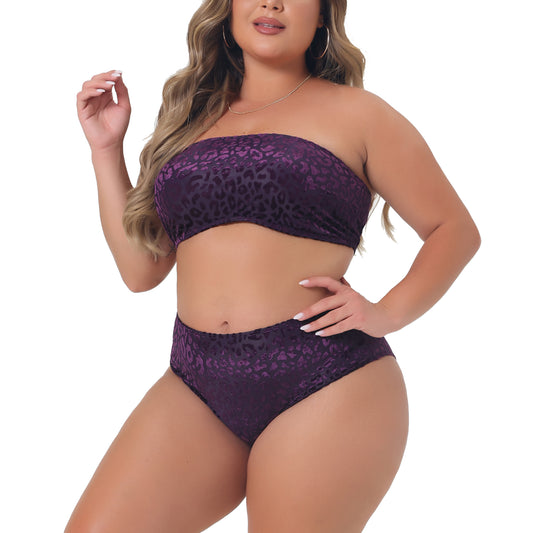 Women Plus Size 2 Piece Bandeau Bikini Velvet Leopard Swimsuit High Waisted Bathing Suit
