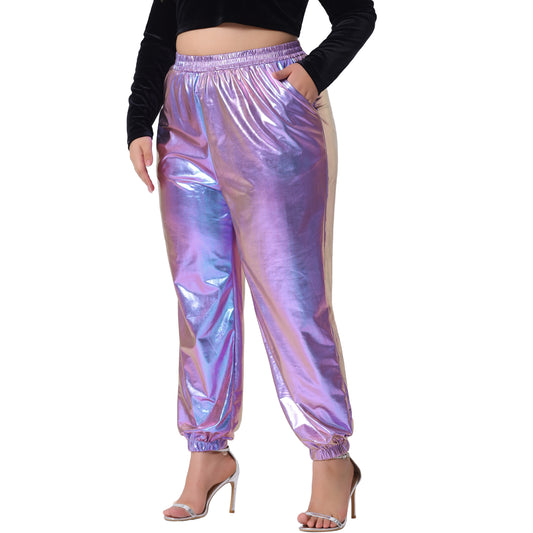 Women Plus Size Jogger Pants Metallic Shiny High Waist Stretchy Wear Holographic Trousers Sweatpant