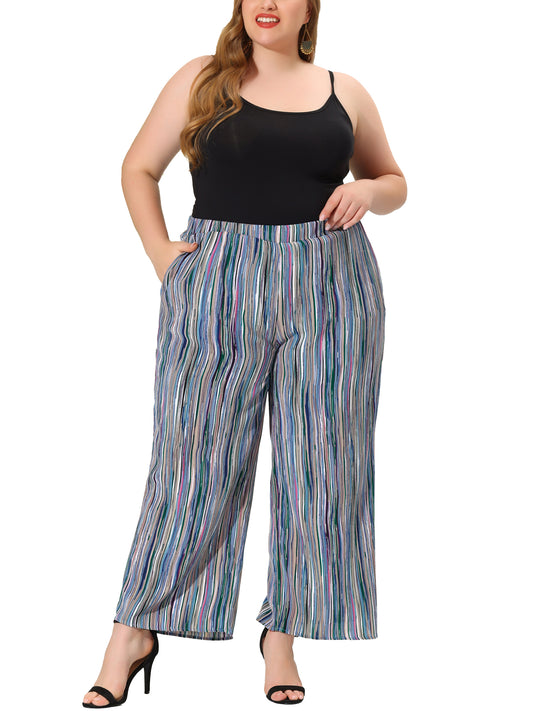 Women Plus Size Palazzo Pants Stripe Boho Wide Leg Paper Bag Pants Beach Casual Summer