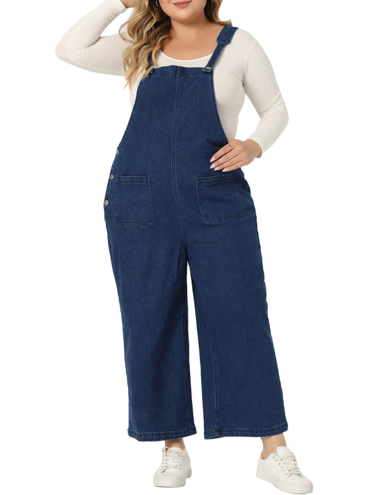 Women Plus Size Overalls Baggy Wide Leg Loose Bib Jeans Pockets Stretch Adjustable Rompers Jumpsuit