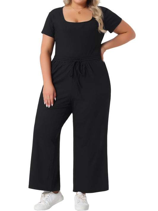 Womens Plus Size 2 Piece Set Square Neck Short Sleeve Bodysuit Top Wide Leg Pants Outfit