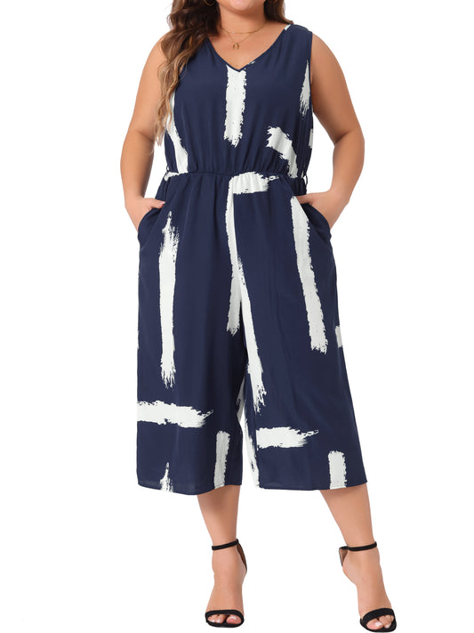 Women Plus Size Jumpsuit Wrap V Neck Sleeveless Tie Waist Jumpsuit Rompers with Pockets