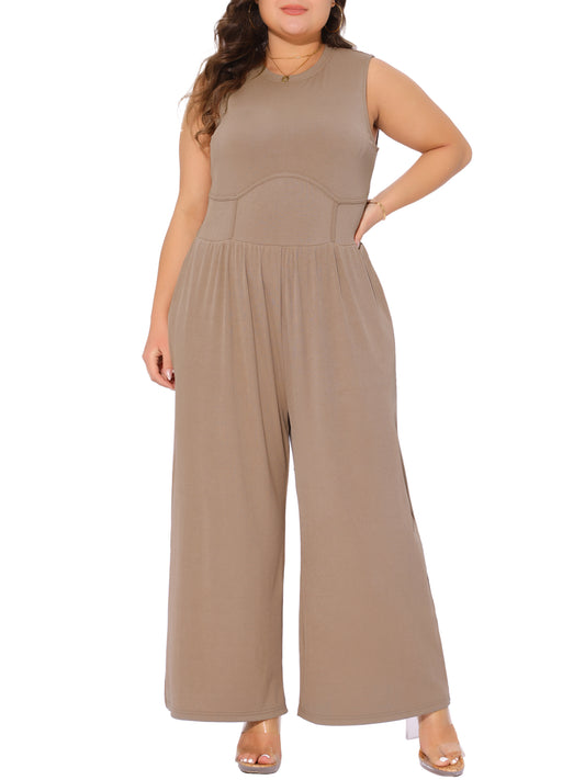 Women Plus Size Jumpsuit Sleeveless Crew Neck Overalls Dressy Wide Leg with Pocket Rompers Summer