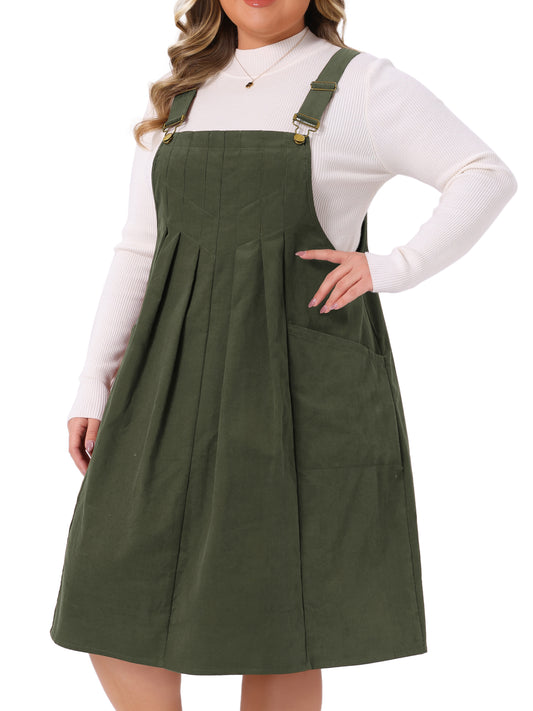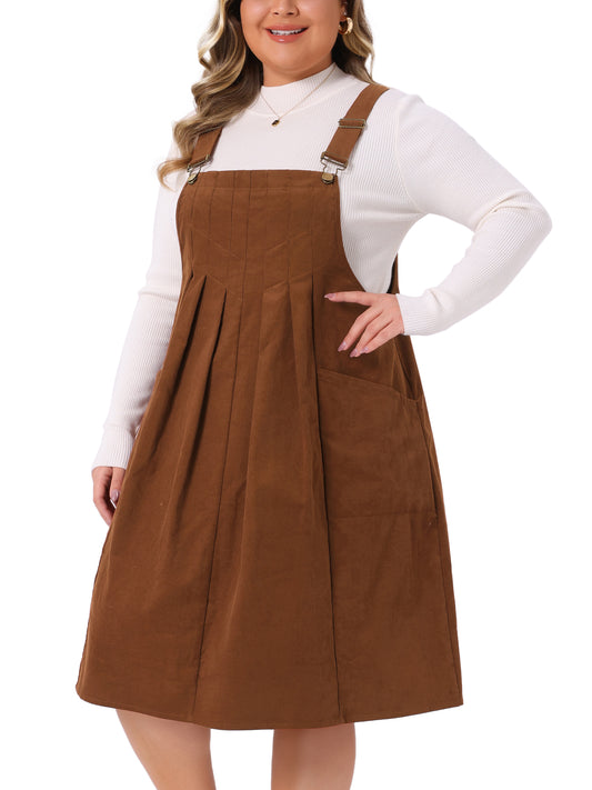 Women Plus Size Corduroy Pinafore Dress Pleated Adjustable Strap Suspender Skirt Short Overall Dress