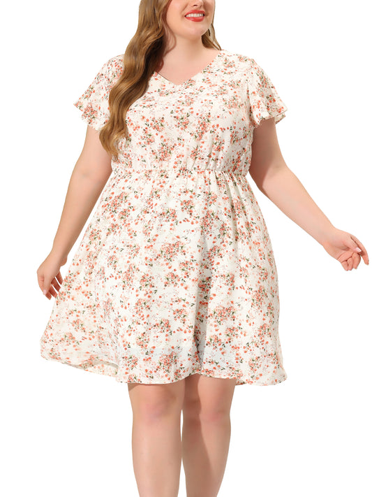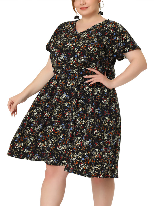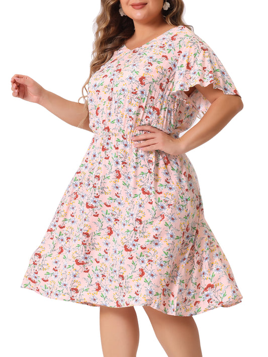 Women Plus Size Summer V Neck Flare Sleeve Sundress Peplum Midi Ruffle Dress