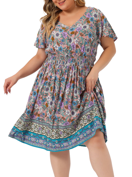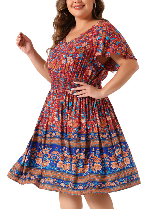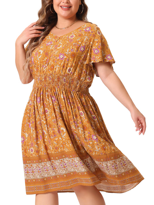 Women Plus Size Placed Pattern Bohemian Smock Waist V Neck Summer Midi Dress