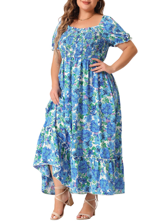 Women Plus Size Short Sleeve Shirred Square Neck Floral Maxi Long Dress