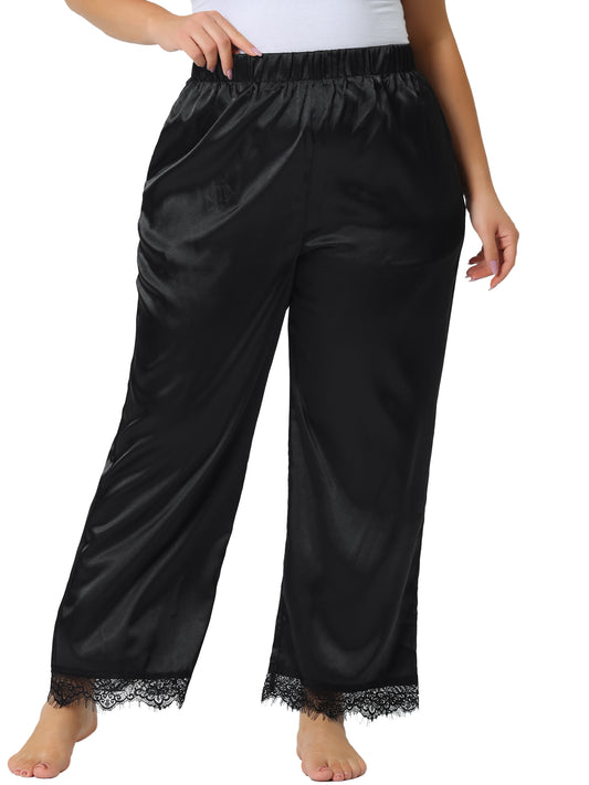 Women Plus Size Lounge Pants Satin Lace Trim Elastic Wide Leg Pockets Sleepwear Pajama Pants