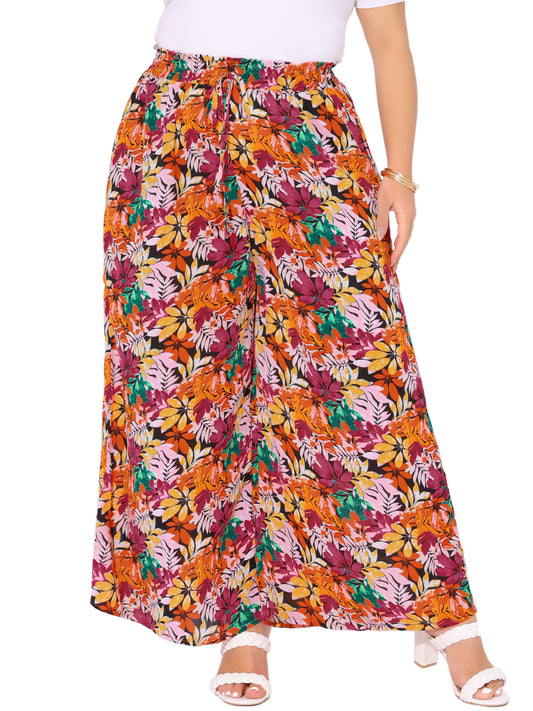 Women Plus Size Palazzo Pants Floral Print High Waist Trousers Wide Leg Pants with Pocket