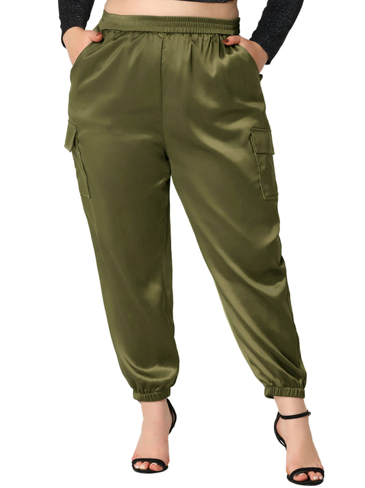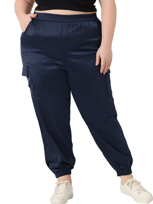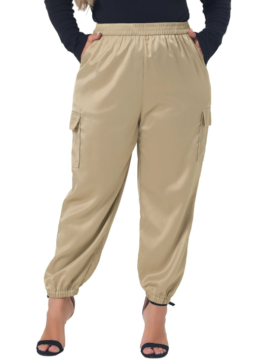Women Plus Size Satin Joggers Elastic Waist Athleisure Ankle Length Cargo Pants with Pocket