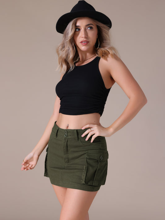 Women's Denim Cargo Flap Pockets Button Fly Stretch Mini Jean Skirt