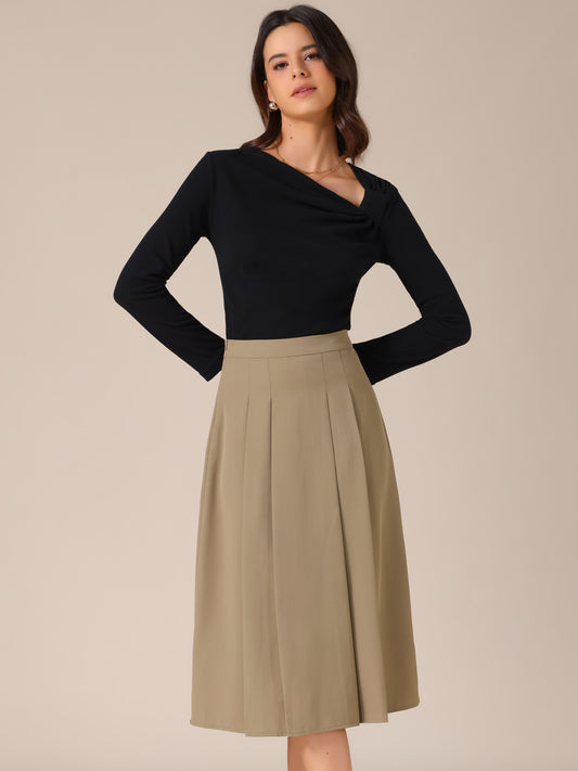 Women's High Waist Fall Work Office A-Line Pleated Midi Skirt
