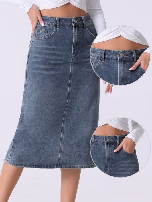 Women's Casual Denim Skirt High Waist Split Back Pockets Midi Jean Skirt