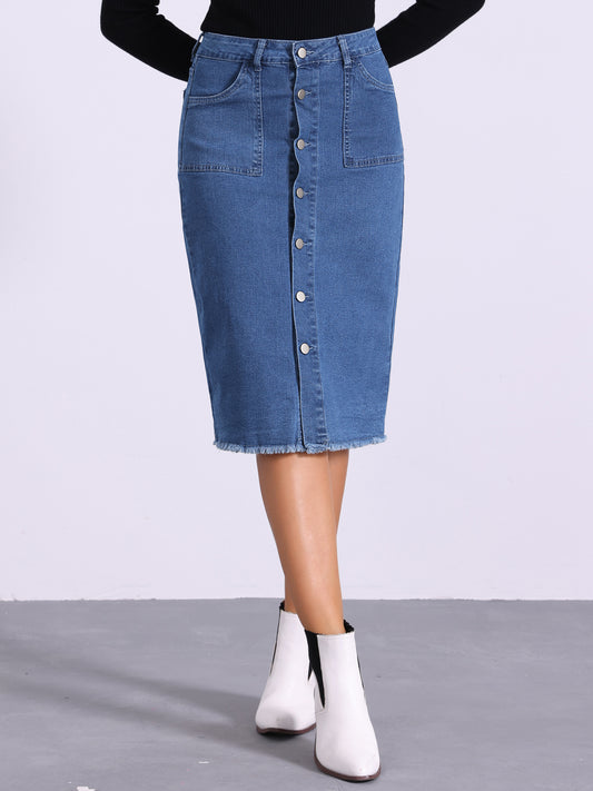 Women's Denim Skirt Raw Hem High Waisted Pockets Stretch Knee Length Jean Skirt