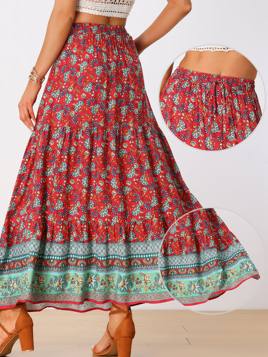 Women's Boho Maxi Skirt Summer Peasant Floral Printed Elastic Waist A Line Long Skirt