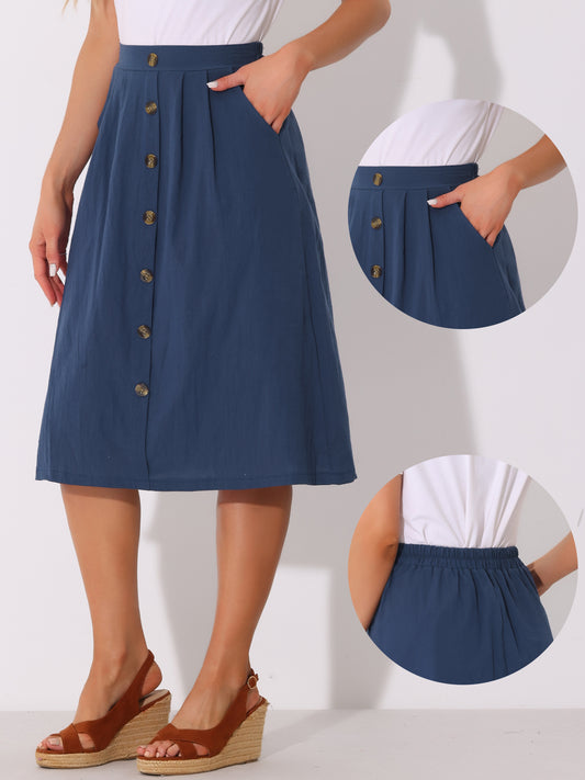 Women Casual High Elastic Waist Button Pleated A Line Midi Skirt with Pockets