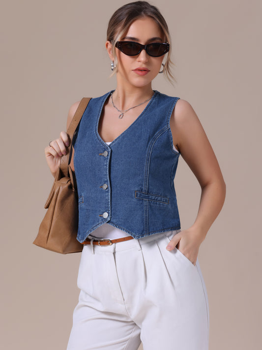 Women's V Neck Button Down Sleeveless Waistcoat Denim Vest
