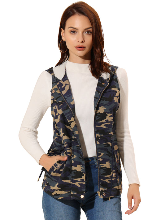 Women's Camo Vest Hooded Drawstring Waist Cargo Sleeveless Jacket