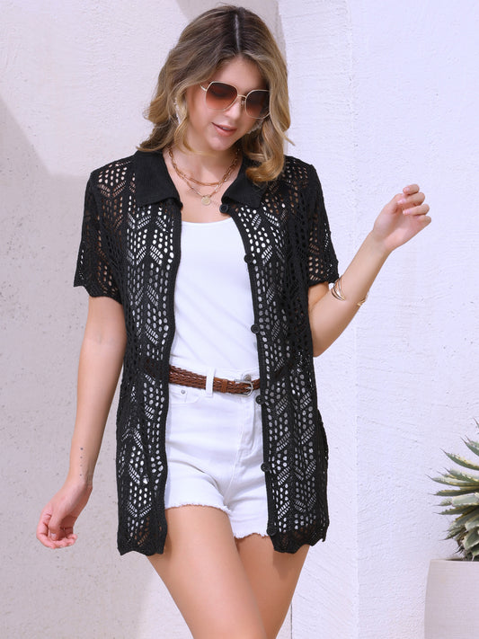 Women's Beach Cover Up Button Down Short Sleeve Crochet Hollow Out Summer Shirt