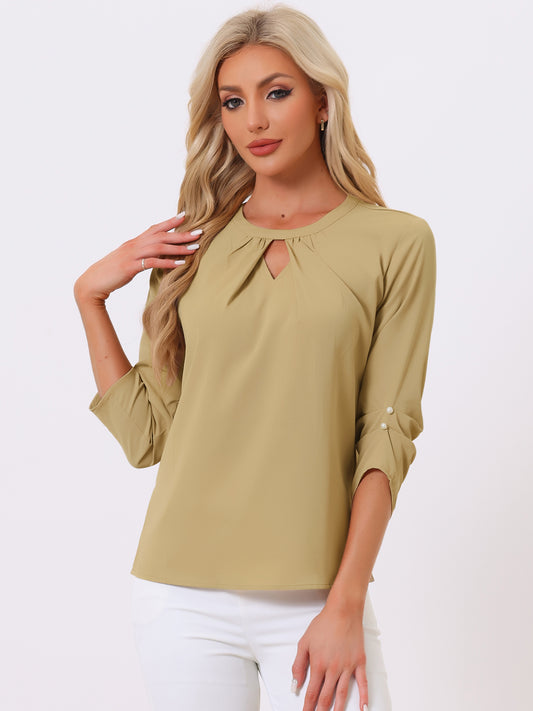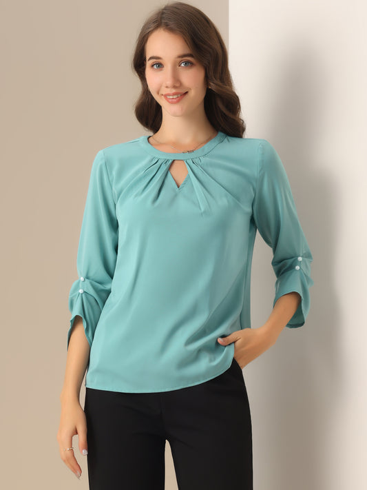Women's Dressy Work Office Keyhole Pleated Front Ruched 3/4 Sleeve Chiffon Shirt