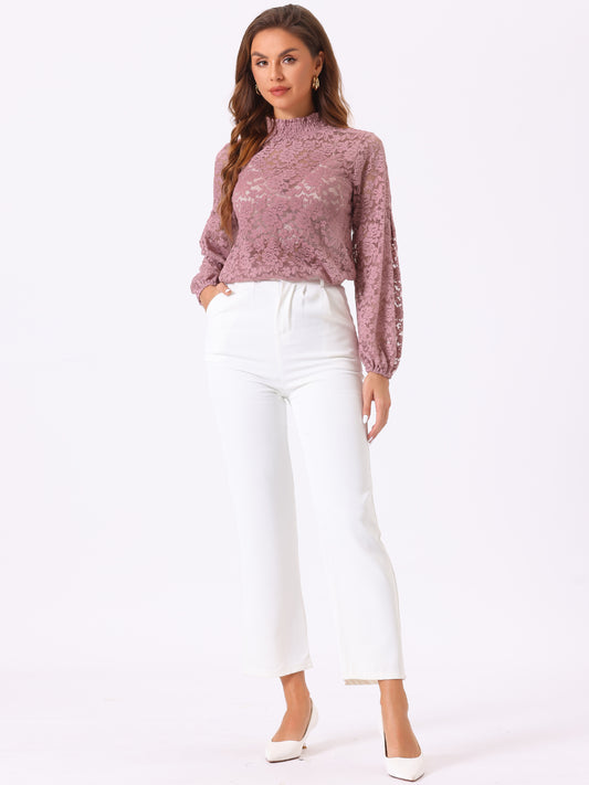 Women's Floral Lace Turtleneck Puff Long Sleeve See Through Sheer Blouse