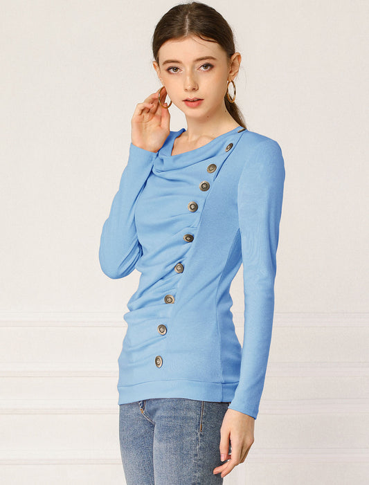 Top fruncido con botones decorativos, mangas largas y cuello vuelto para mujer