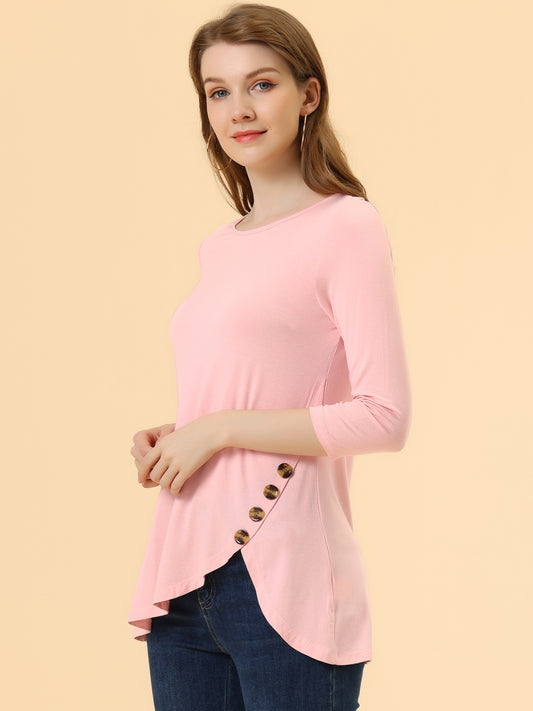Camiseta tipo túnica para mujer, cuello redondo, manga 3/4, dobladillo asimétrico holgado, informal, básica