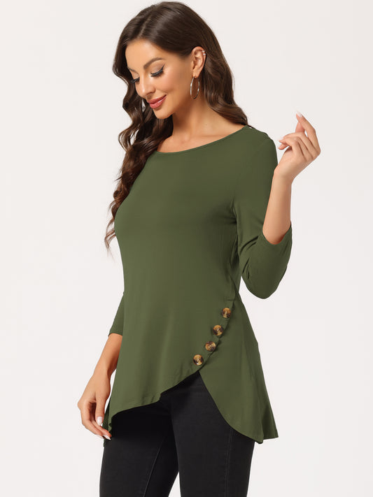 Camiseta tipo túnica para mujer, cuello redondo, manga 3/4, dobladillo asimétrico holgado, informal, básica