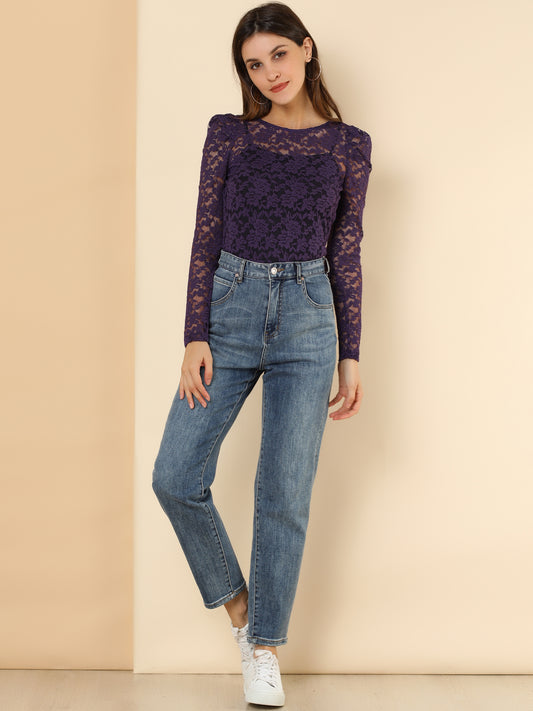 Women's Floral Lace Turtleneck Puff Long Sleeve See Through Sheer Blouse