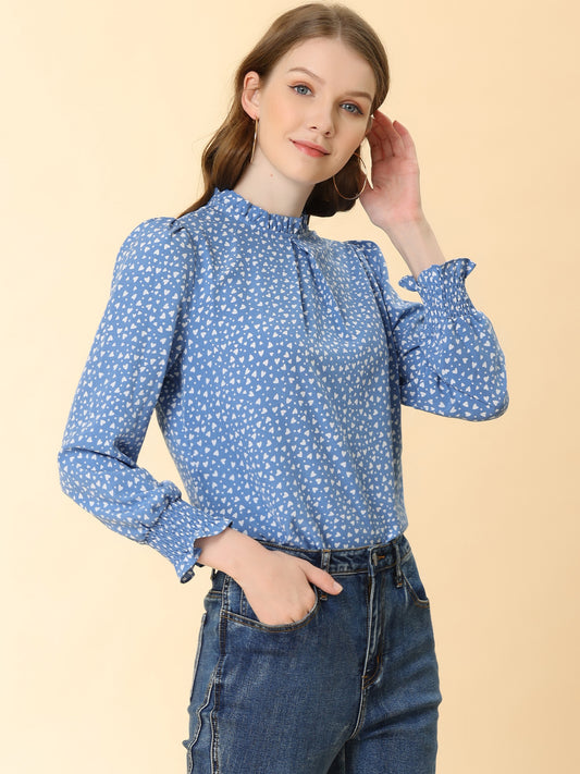 Women's Printed Ruffled Mock Neck Puff Long Sleeve Blouse Top