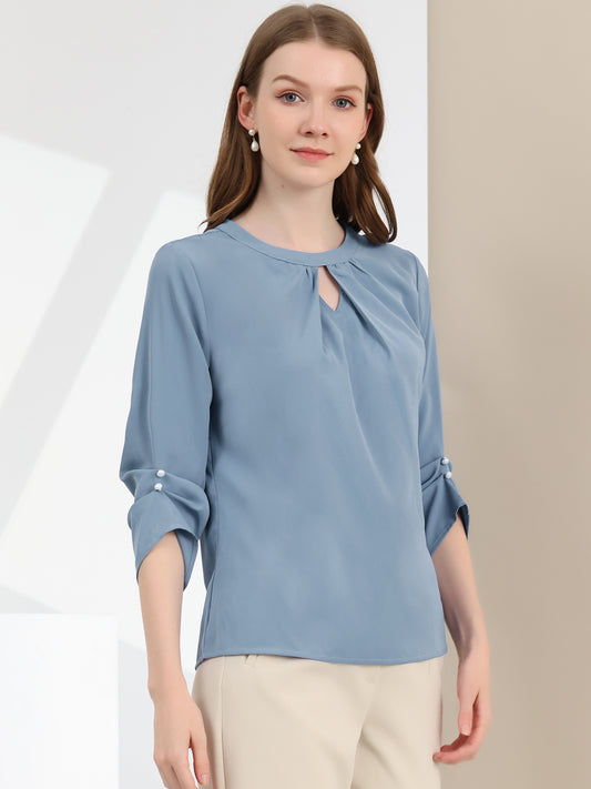 Women's Dressy Work Office Keyhole Pleated Front Ruched 3/4 Sleeve Chiffon Shirt