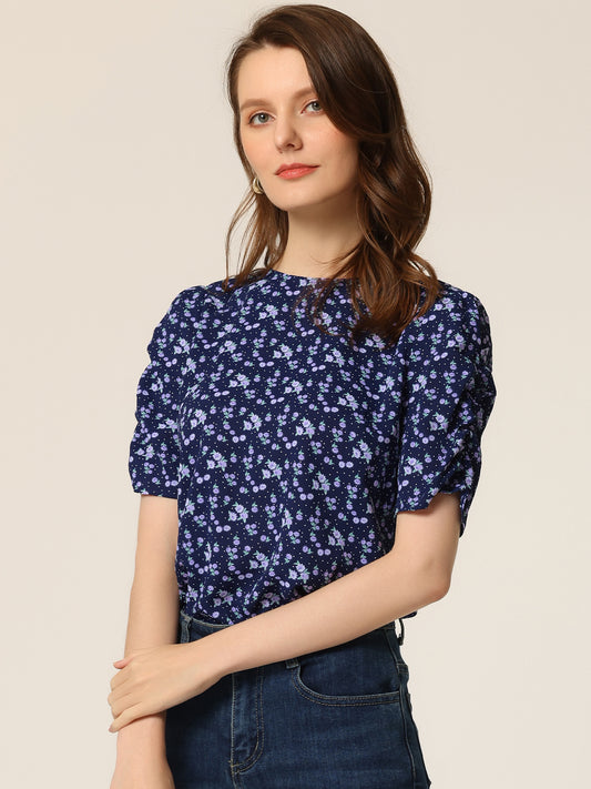 Women's Floral Crew Neck Summer Shirred Short Sleeve Blouse