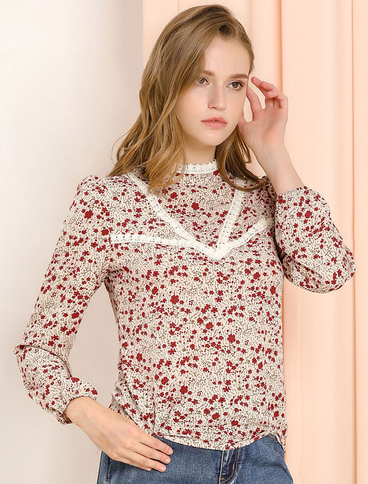 Women's Lace Trim Stand Collar Long Sleeves Floral Blouse Top