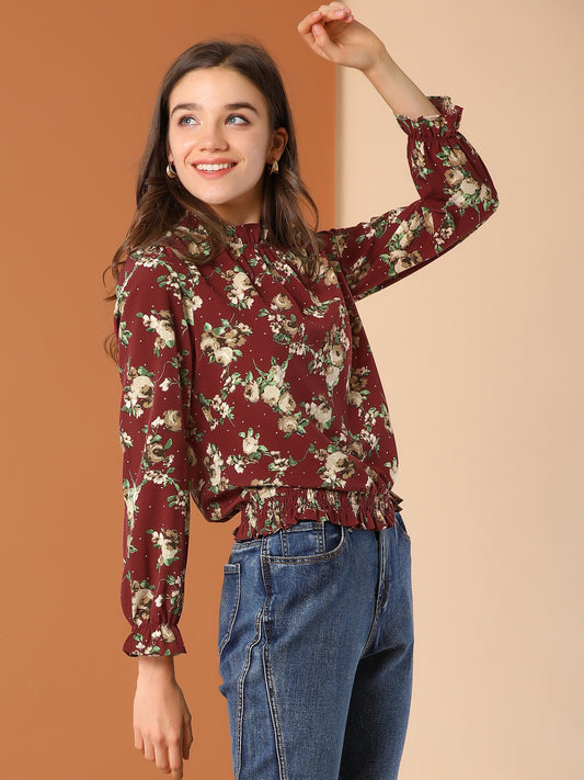 Women's Ruffled Floral Printed Vintage Collared Smocked Waist Blouse